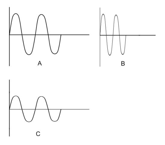 | The graphs show the sound which sensed by human ears. Frequency is the pitch of the voice, the higher the voice frequency is, the high-pitched sound we sense. The frequency of graph B is twice as much as graph A, which means B vibrates double within the same time. However the amplitude decides the volume of sound, graph C shows the smaller wave than A, so we will sense lower volume of sound in C.